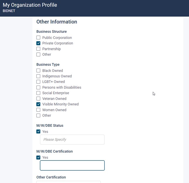 When a vendor registers, Merx gives them the opportunity to select the type of business and the certifications they currently have, including their status and the certification number. This information is then part of the vendor search criteria for participating buyers.